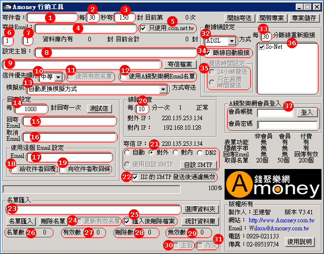 行銷工具 免安裝版(舊版) | 軟體安裝方式 只須解壓後執行 AutoEmail.exe 免安裝直接執行 預設安裝路徑 C:\Amoney | 本軟體檔案下載 版本V4.15 |